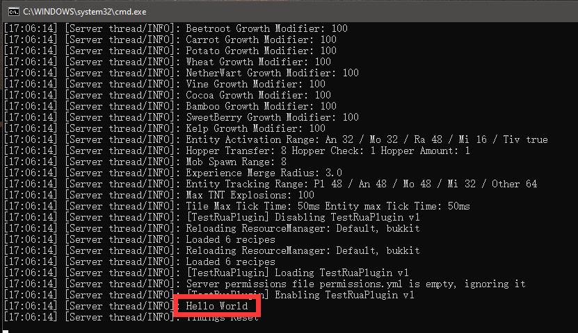 可以发现, 当插件Jar被正常加载后, 会在控制台输出Hello World字符串, 这标志着我们的HelloWorld插件正常工作.
