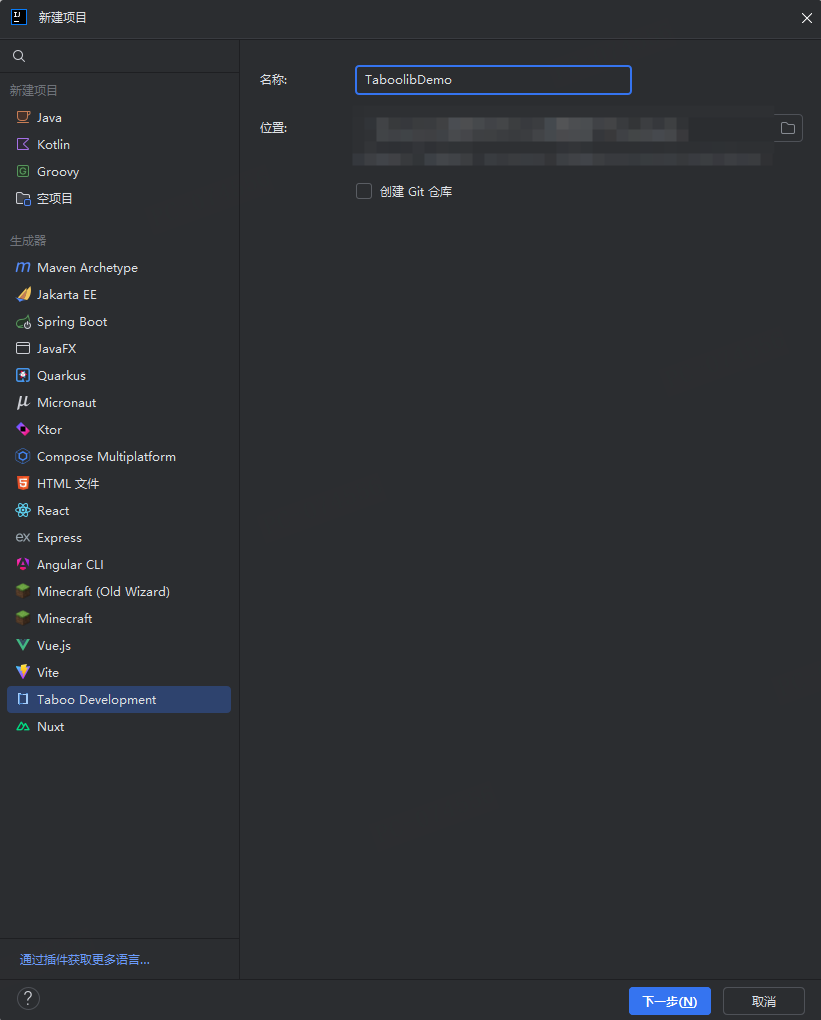 新建项目中选择 Taboo Development . 选择项目名称和项目位置.