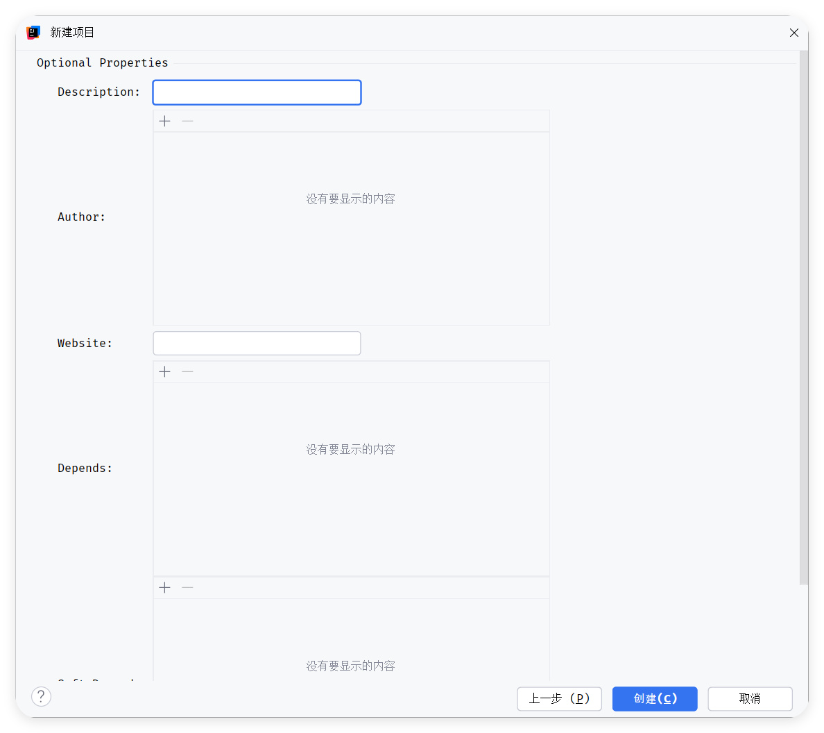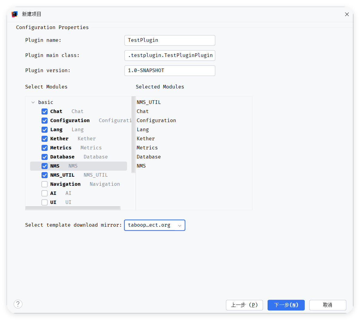 输入插件名、 主类、 版本等信息 选择需要用到的模块