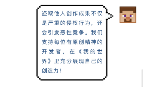 为了维护开发者生态的健康发展,网易《我的世界》中国版将不留余力保护原创内容,坚决打击各种侵犯他人权益的行为,针对原创保护有以下两大制度规定: