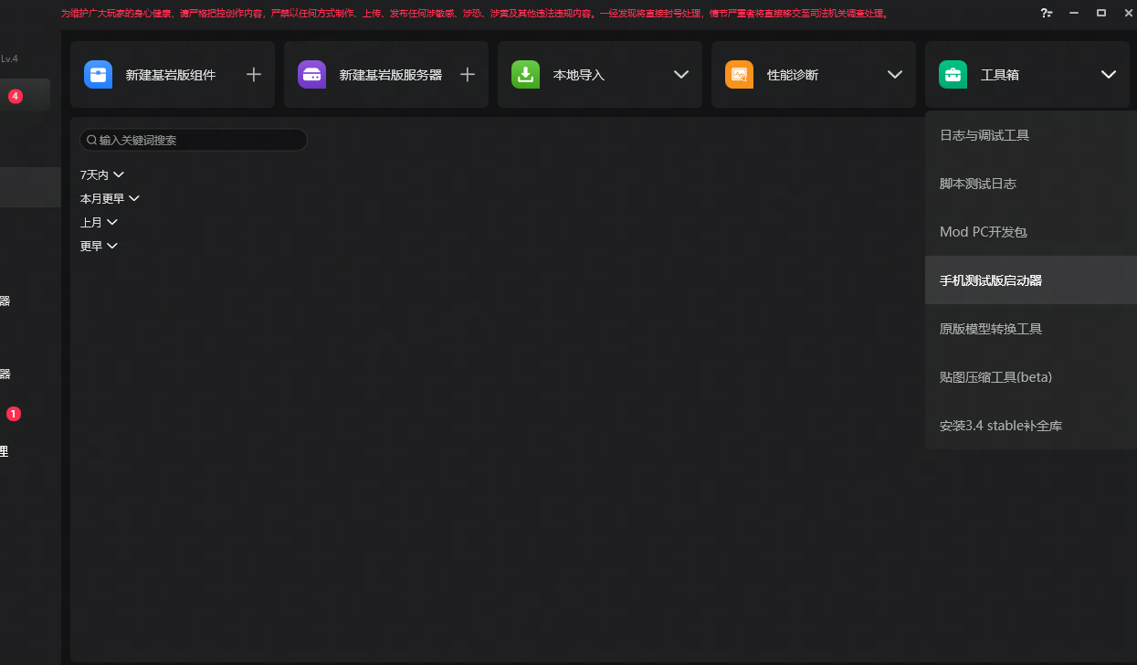 打开MCSTUDIO,点击右上角的【工具箱】。选择【手机测试版启动器】。