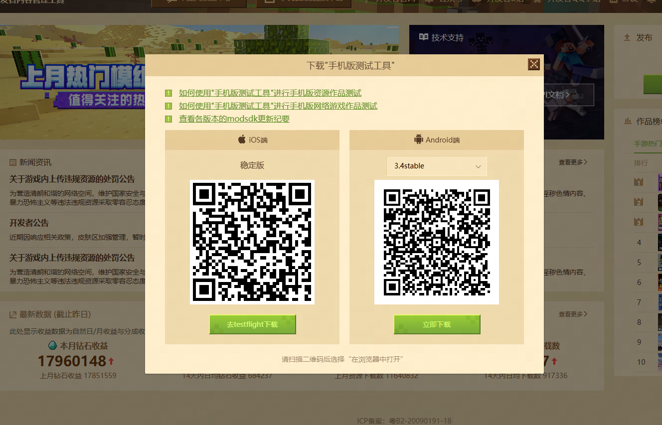 MCSTUDIO会打开浏览器并自动跳转到【开发者内容管理工具】的二维码链接上。开发者通过手机扫描二维码的功能就能下载到手机测试客户端。