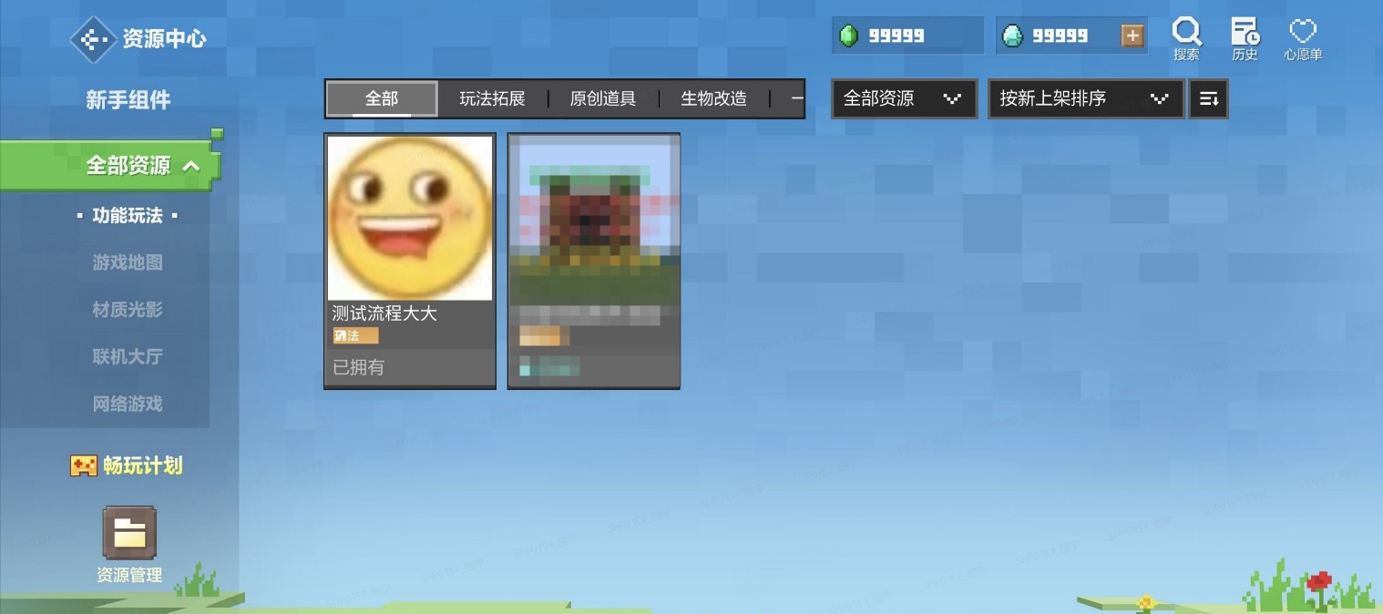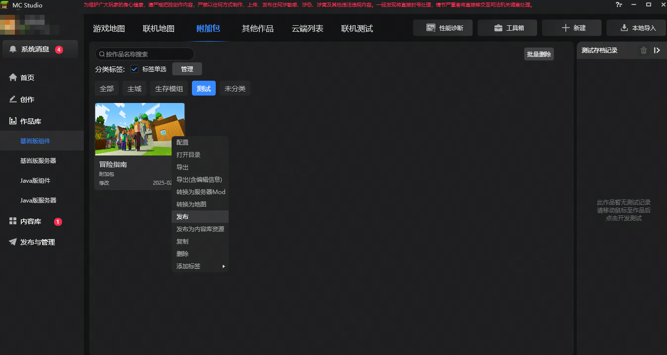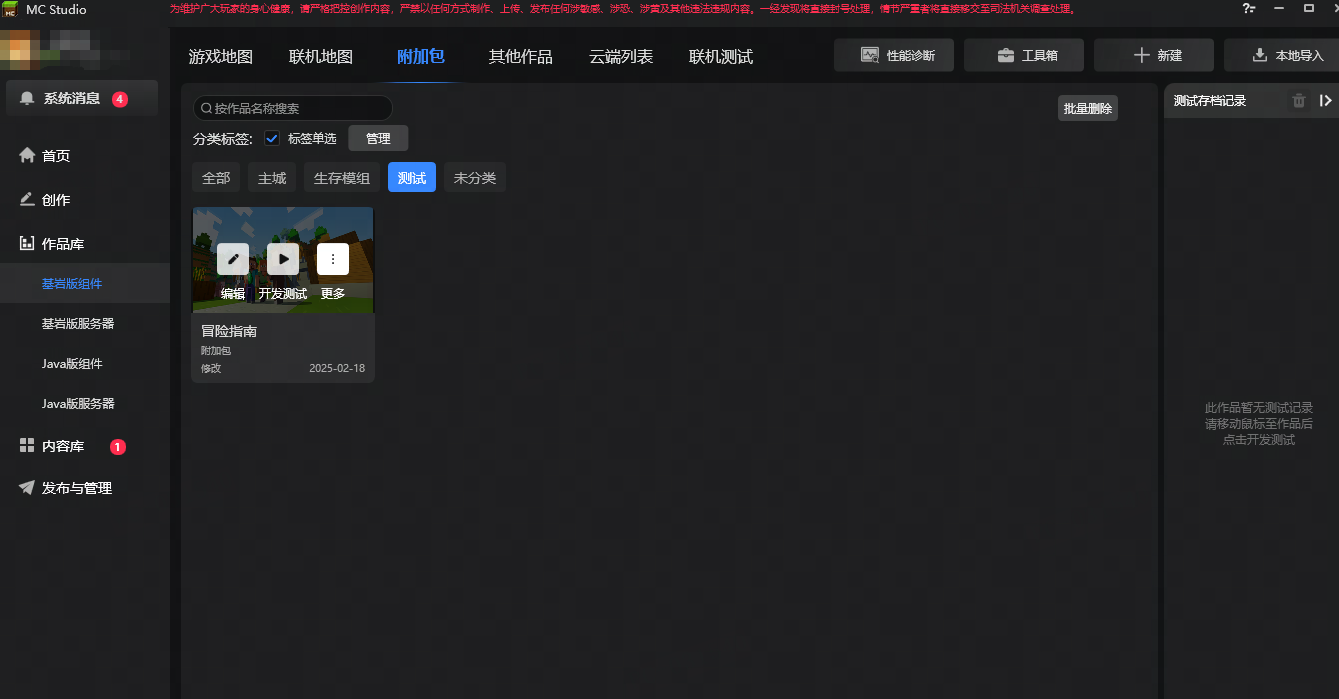 基岩版资源可以使用手机自测客户端或MODPC客户端进行测试。在MCSTUDIO主界面上点击【作品库】,再点击资源所在的标签分类。鼠标悬浮在资源窗体上方直至显示出【开发测试】按钮后,点击【开发测试】按钮即可。
