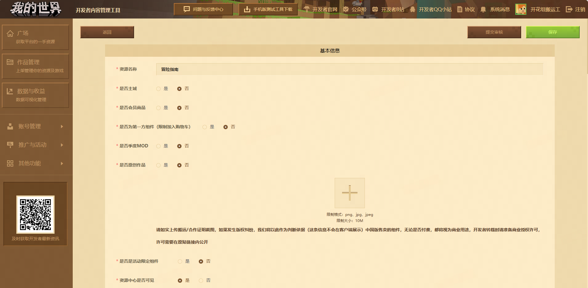 MCSTUDIO会自动打开浏览器的【开发者内容管理工具】的【发布资源】窗口,并自动预备上传好资源,开发者只需填写基本信息、收费模式、宣传素材等即可。最后记得点击【保存】按钮。