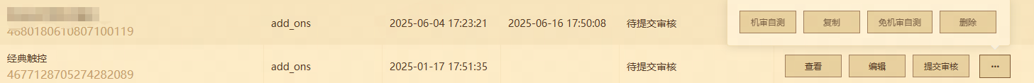 建立好的基岩版资源处于【待提交审核】状态。在这个状态下,开发者可以点击组件对应条目行尾的【...】并在展开菜单中选择【机审自测】或【免机审自测】,机审自测会帮助您额外检测一些违规模块的使用。自测的组件最后会上架至开发者自测手机客户端。