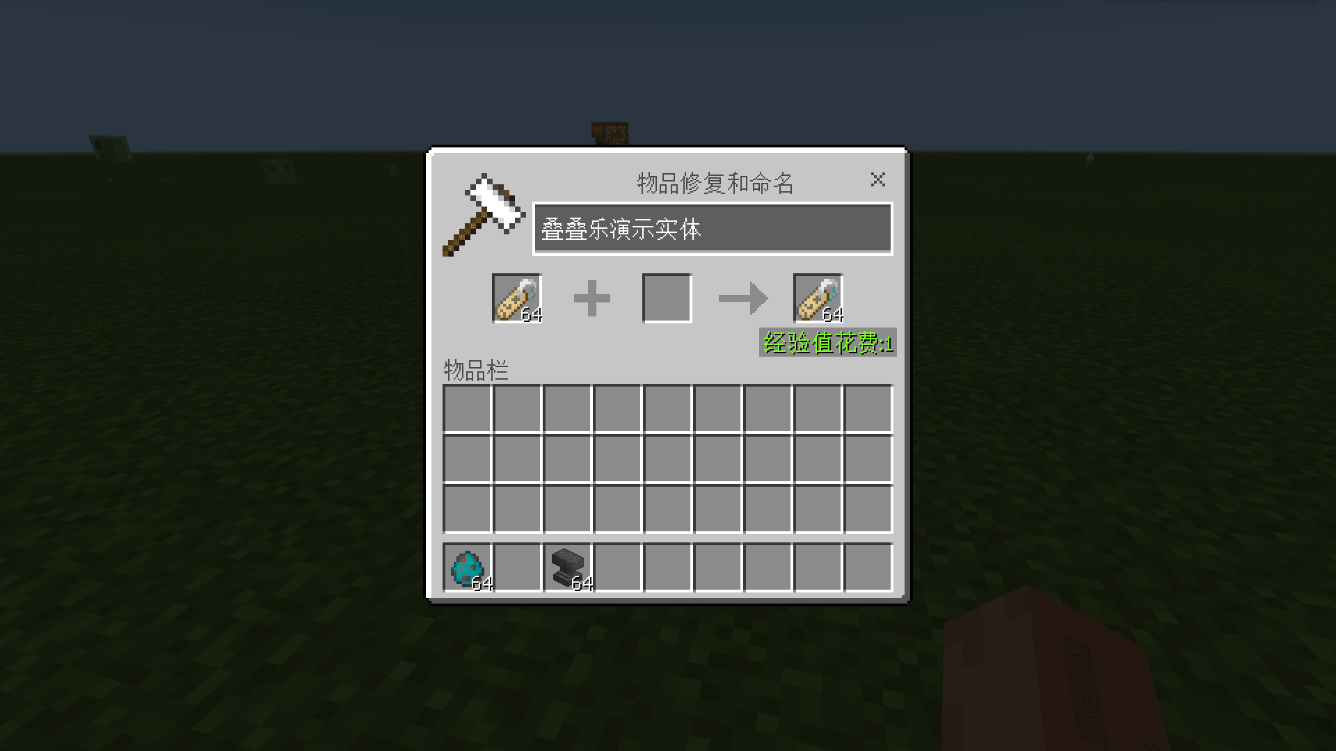 我们希望使用/ride命令来使一个尸壳骑乘另一个尸壳,然而尸壳不是玩家,所以不能使用玩家名作为target类型的参数值,我们必须使用目标选择器。为了使目标尸壳被精确选中,我们可以使用name选择器参数,因此我们需要给这个尸壳命名。使用铁砧和命名牌使尸壳获得一个名字。