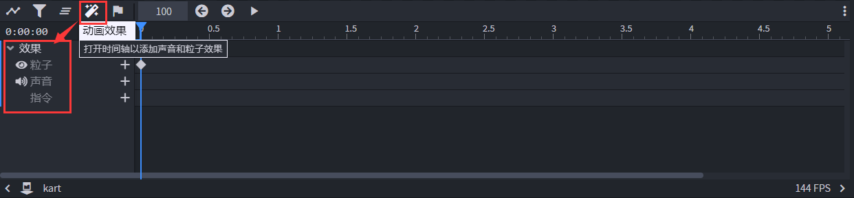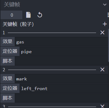 点击“动画效果”按钮,我们可以在时间轴中看到一个除了骨骼之外的额外的动画主体,那便是包含了粒子、声音和命令的效果主体。我们点击“粒子”通道右侧的“+”按钮,为其添加一个0.0的关键帧。