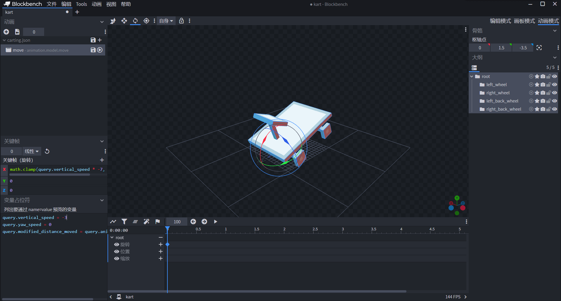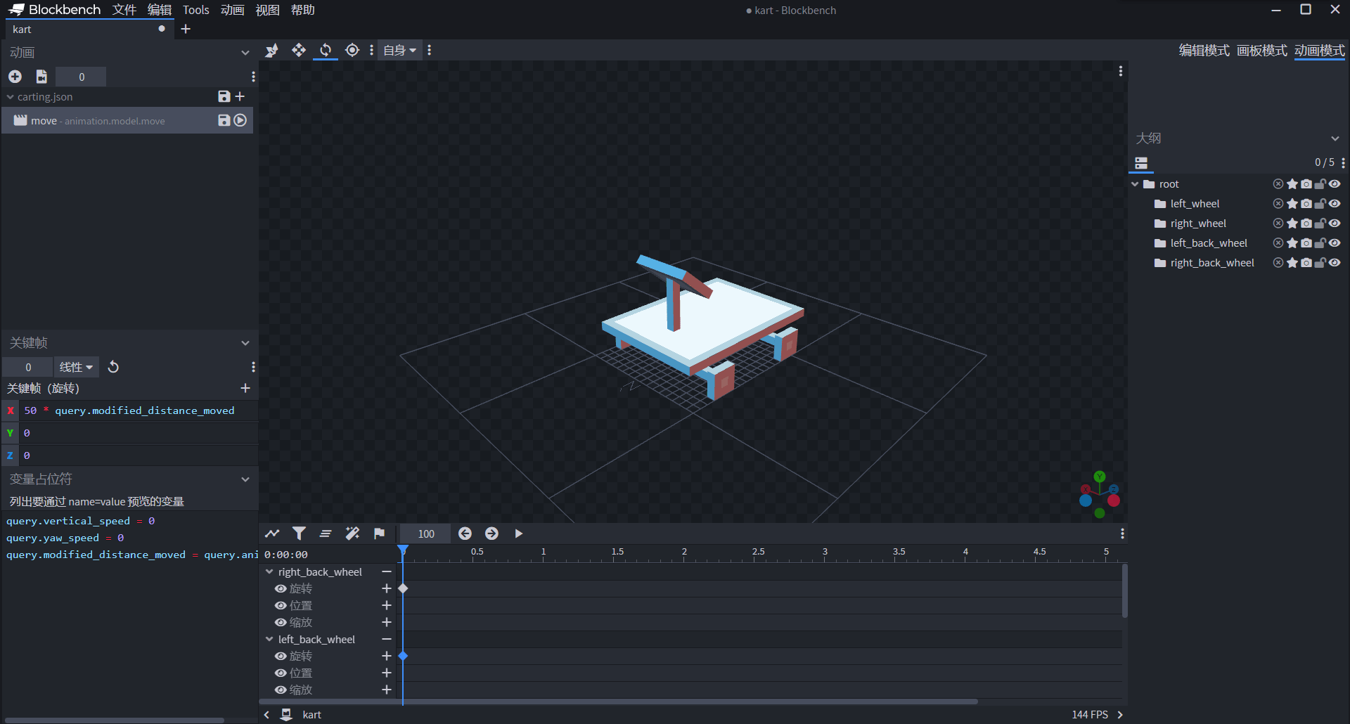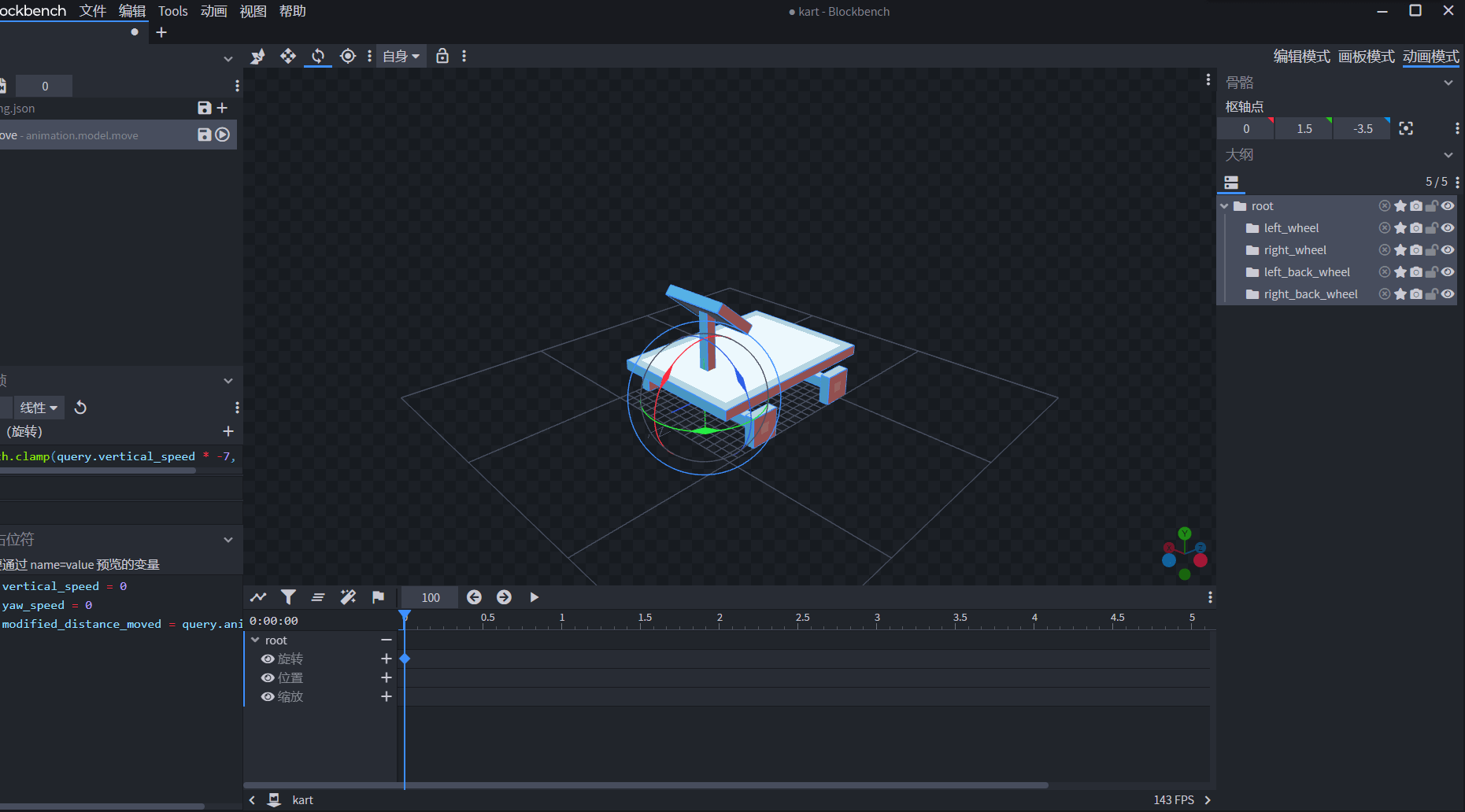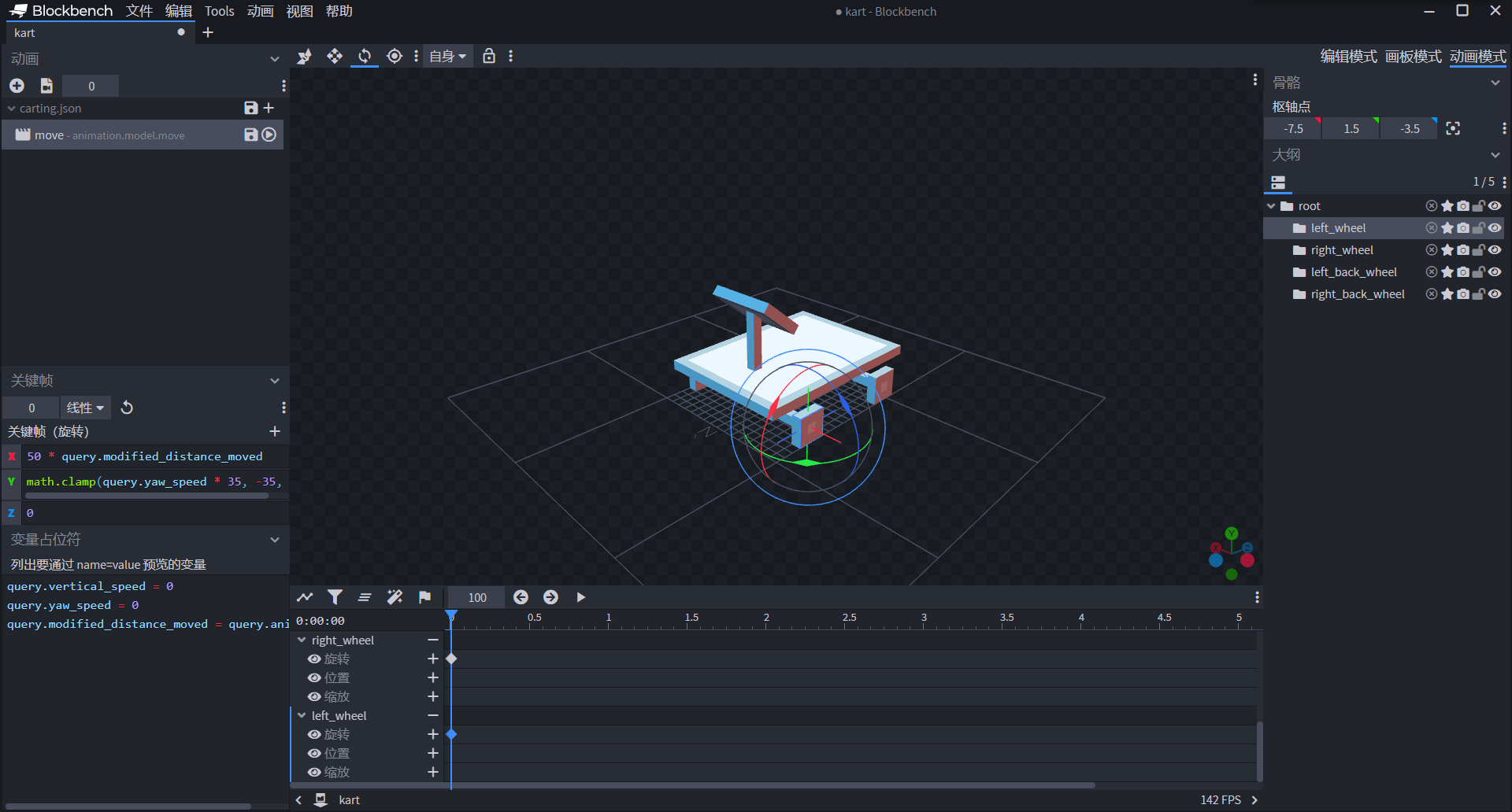 通过查阅文档,我们可以得知query.modified_distance_moved查询函数可以用于返回一个实体从进入世界到当前时间移动的总距离。我们可以使用这个查询来进行车轮向前移动的动画。我们更改$yOz$面的转角,即X轴向所代表的字段,比如,将其设置为50 * query.modified_distance_moved。我们将四个轮胎设置为同样的值,这样可以保证四个轮子转速一致。