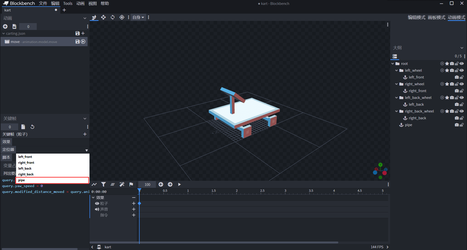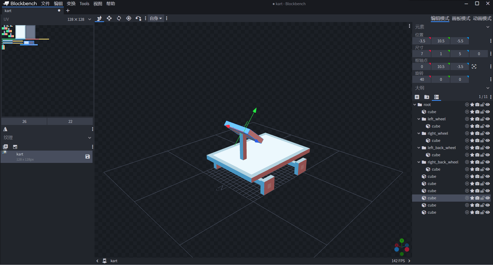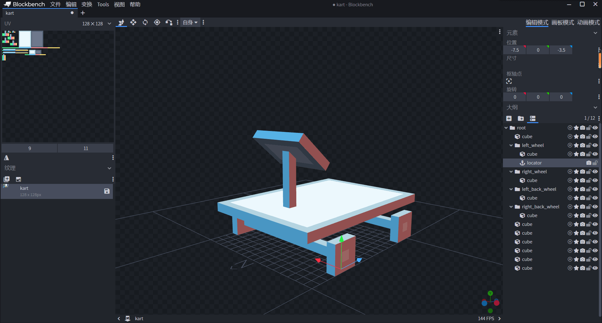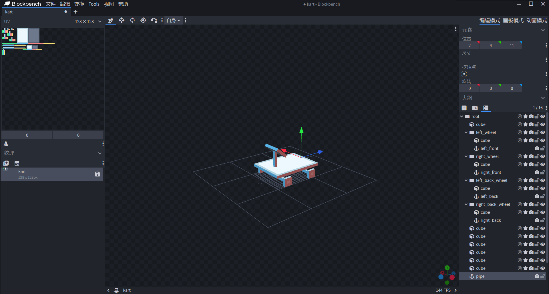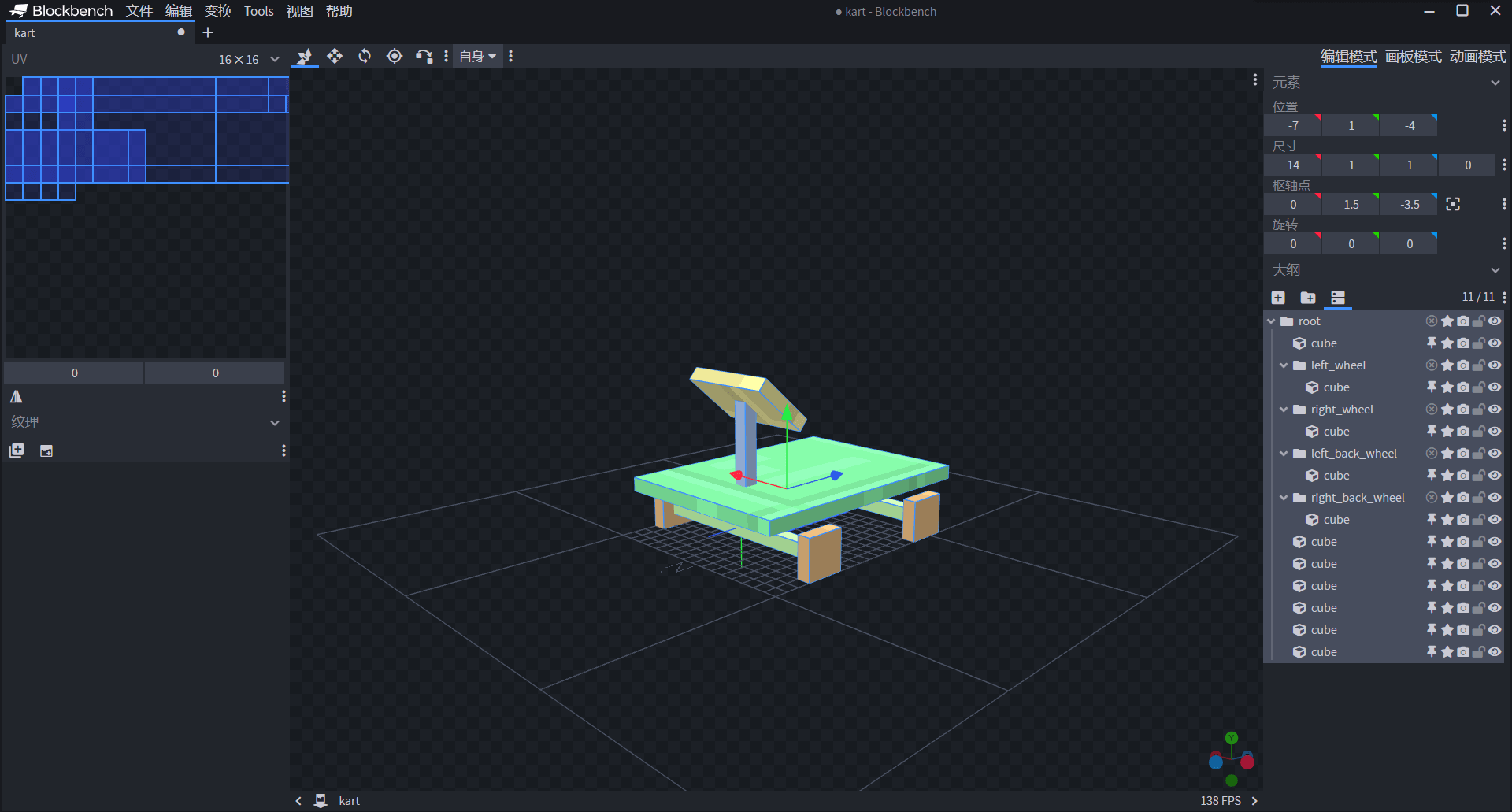 在本节中,我们一起来制作一个卡丁车。这次的挑战主要是针对Molang的复习和更多复杂应用的学习,所以卡丁车本身模型的精细便置为次要目标,同时我们将精力全部放在Molang相关的表达式的编写过程上。