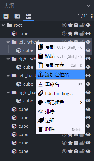 我们回到“编辑”模式,在右侧的“大纲”窗格上选中我们想加入定位器的骨骼,右键点击“添加定位器”。