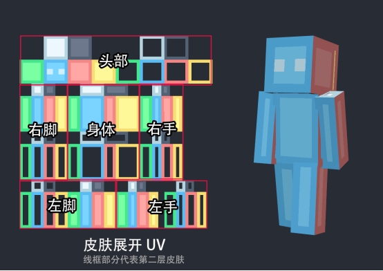 下面展示的是一张皮肤的展开图。皮肤实际上就是由这样一张贴图构成的,我们只需修改其中的像素点,整个皮肤就会随之发生变化。