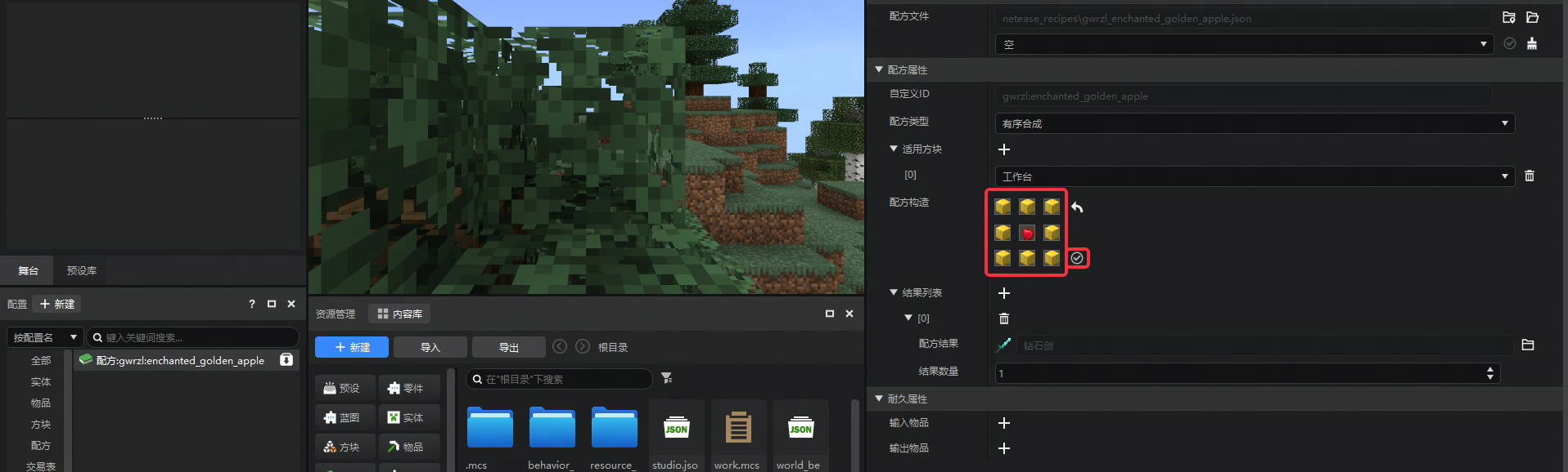点击 **配置面板 **的 新建 , 直接创建 一个配方并命名为 enchanted_golden_apple 。
