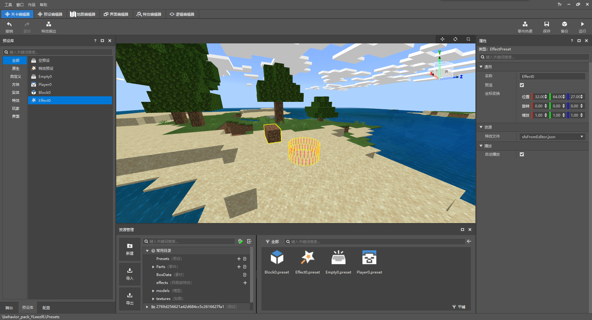 比如我们在预设编辑器将两个预设进行组合,把特效和泥土预设组合到一起。