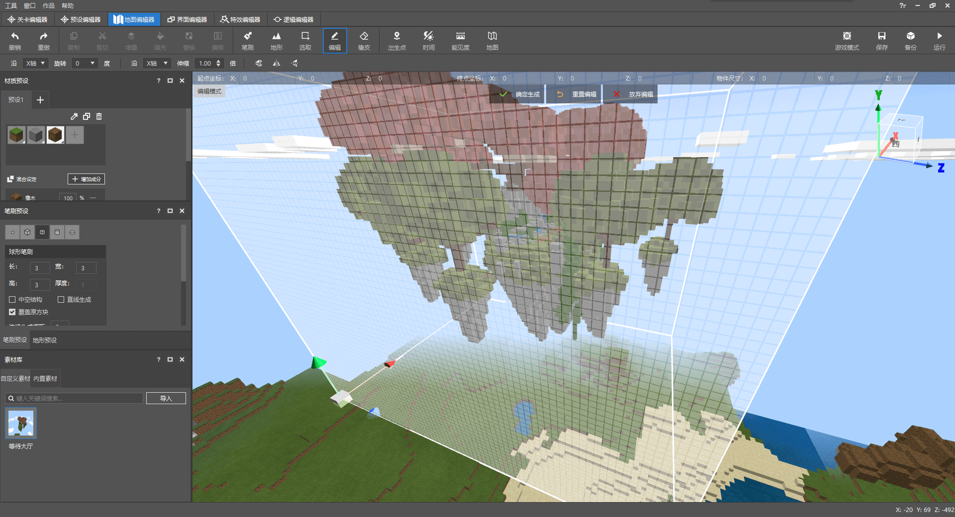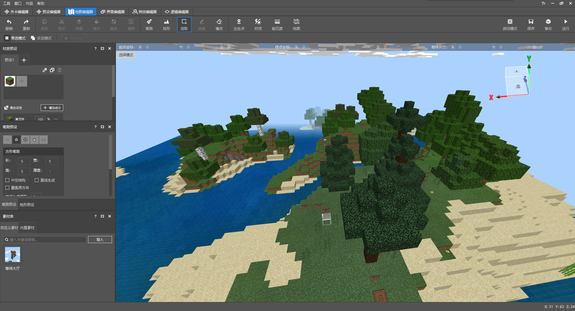 例如使用笔刷工具,可以选择我们需要选择方块、笔刷类型,然后像画画一样直接在游戏内进行建筑的制作。